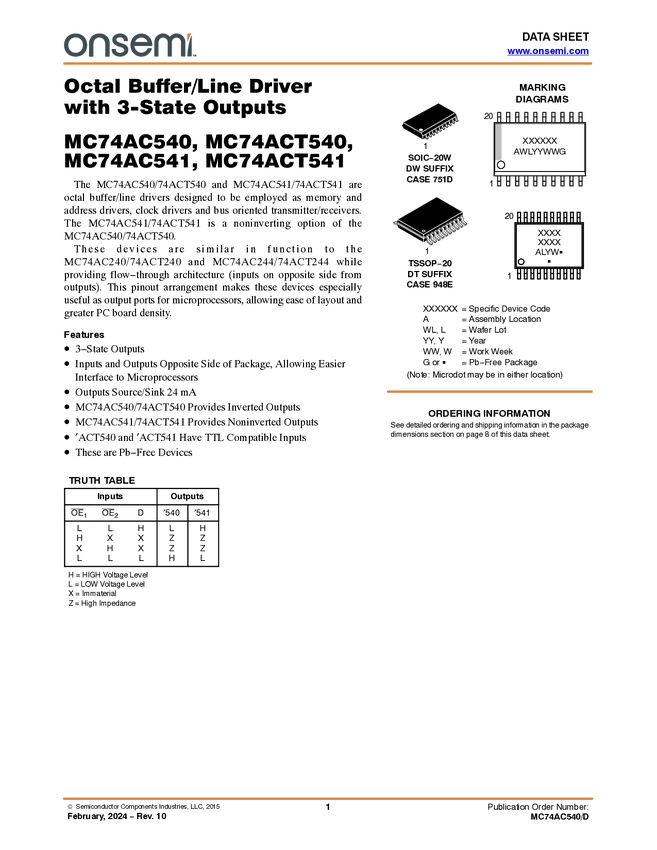 MC74ACT541 Octal Buffer/Line Driver with 3-State Outputs