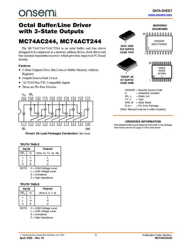 MC74ACT244 Octal Buffer/Line Driver, 3-State
