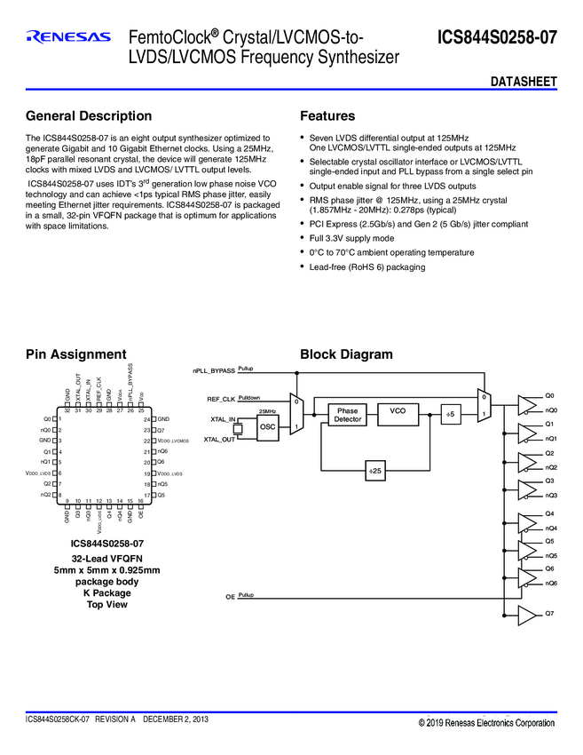 844S0258CK-07LF FemtoClock™ Crystal/LVCMOS-to-LVDS/LVCMOS Frequency Synthesizer