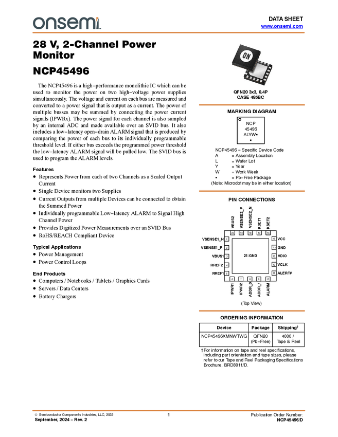 NCP45496 2-Channel High-Side Power Monitor, 28V