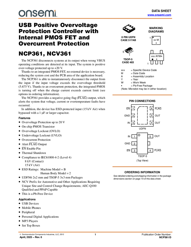 NCP361 Overvoltage Protection Circuit, USB Positive, with Internal PMOS FET and Ov...