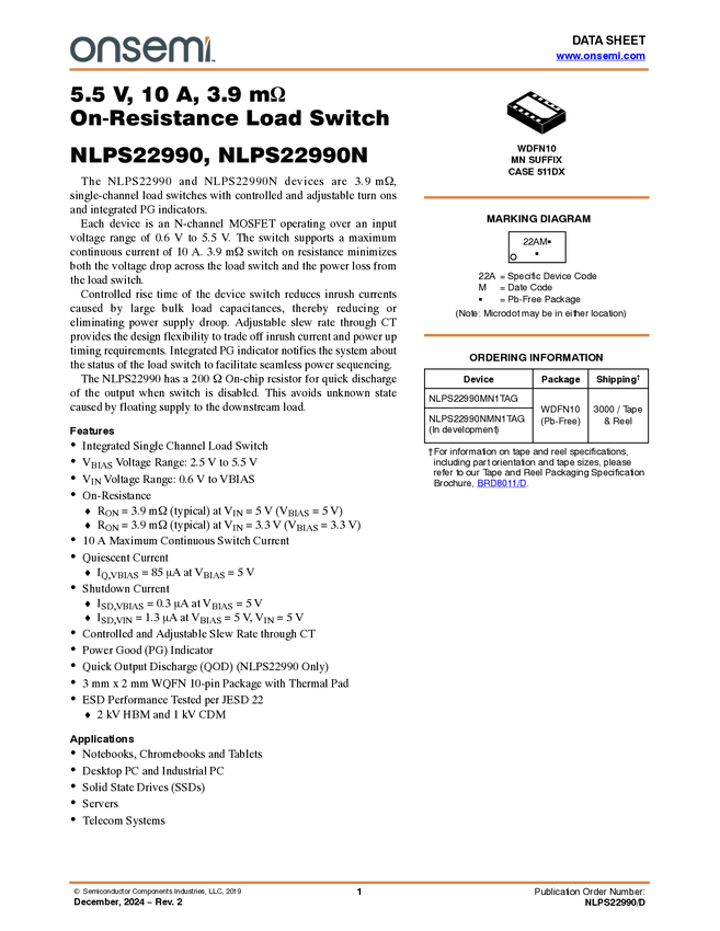 NLPS22990 5.5 V, 10 A, 3.9 mΩ On-Resistance Load Switch