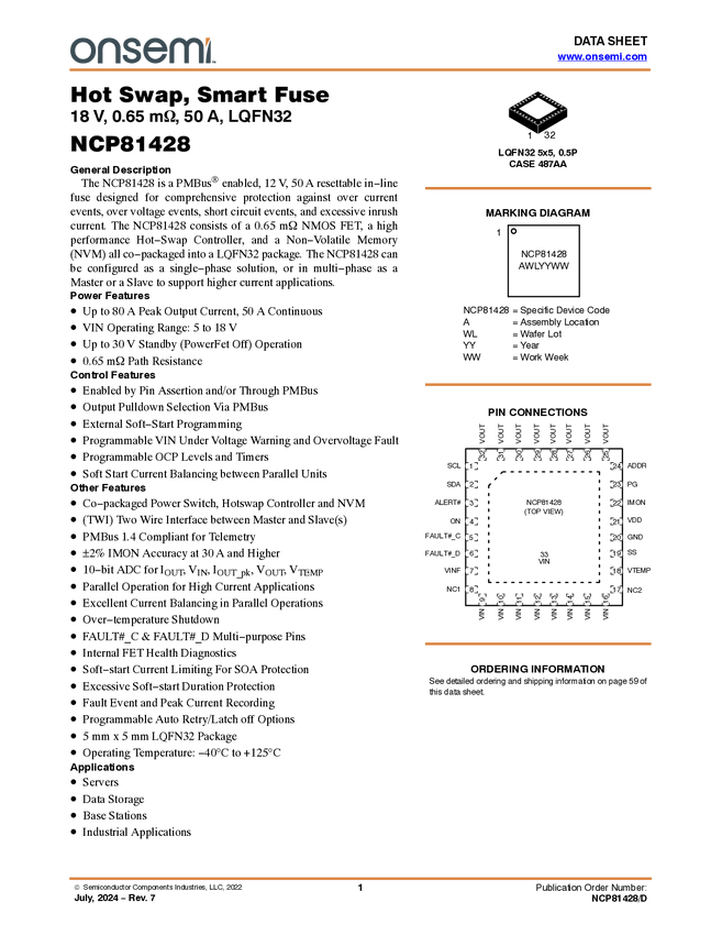 NCP81428 Hot Swap Smart Fuse, 18 V, 0.65 mΩ, 50 A, LQFN32