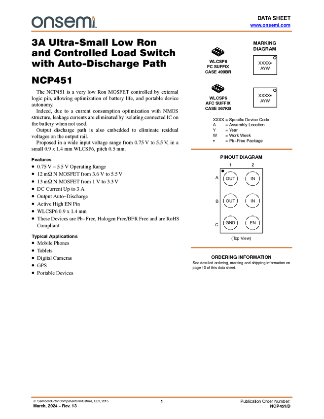 NCP451 Controlled Load Switch, Ultra-Small, Low Ron, 3.0 A, with Auto-Discharge Pa...