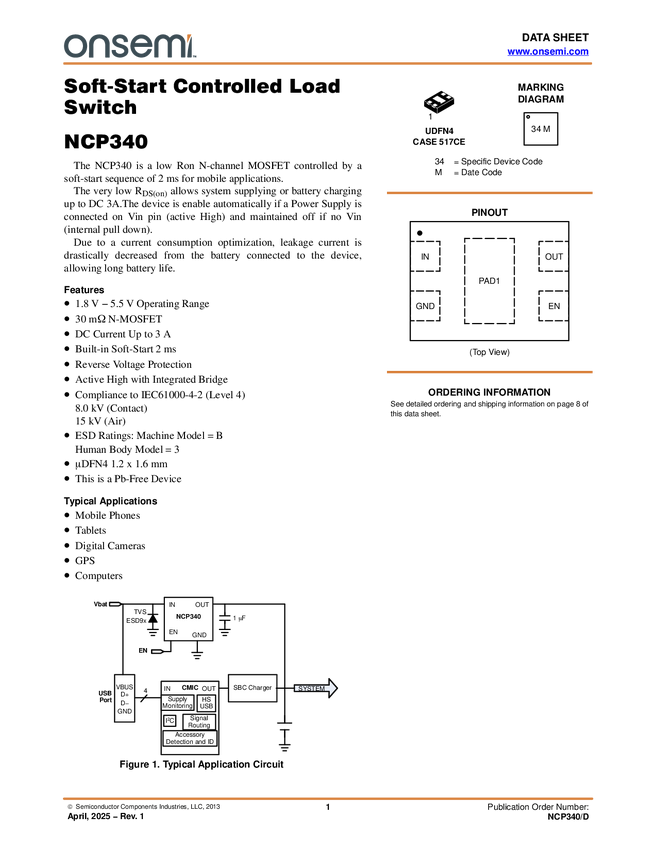 NCP340 Controlled Load Switch, Soft-Start, 3.0 A