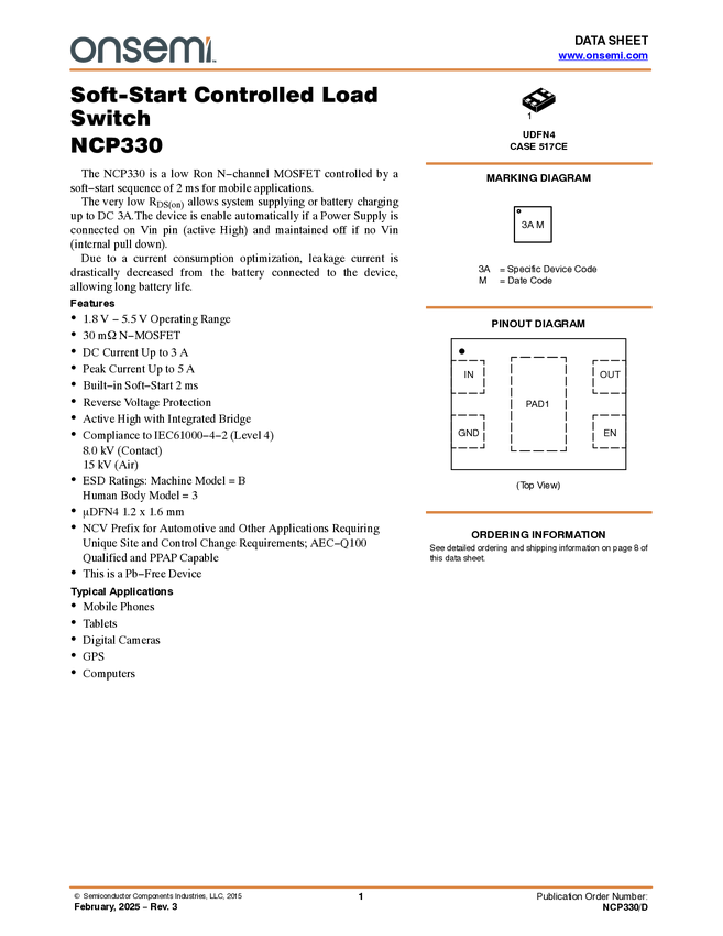 NCP330 Controlled Load Switch, Soft-Start, 3.0 A