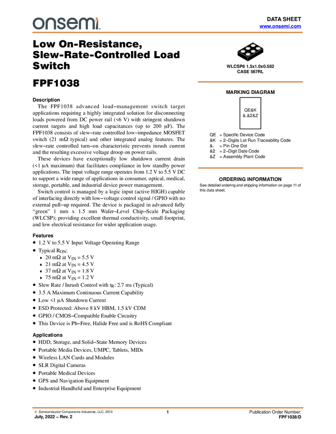FPF1038 Low On-Resistance, Slew-Rate-Controlled Load Switch