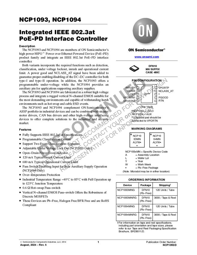 NCP1093 Integrated PoE-PD Interface Controller with Vaux support, IEEE 802.3at, 30W