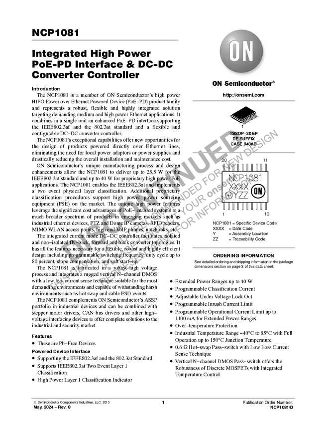 NCP1081 Integrated PoE-PD and DC-DC Converter Controller, 40 W