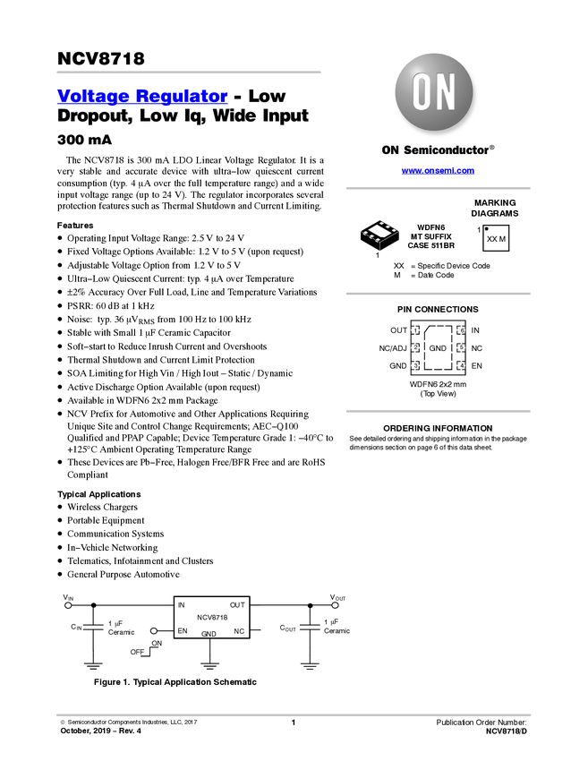 NCV8718 LDO Regulator, 300 mA, Wide Vin, Ultra-Low Iq