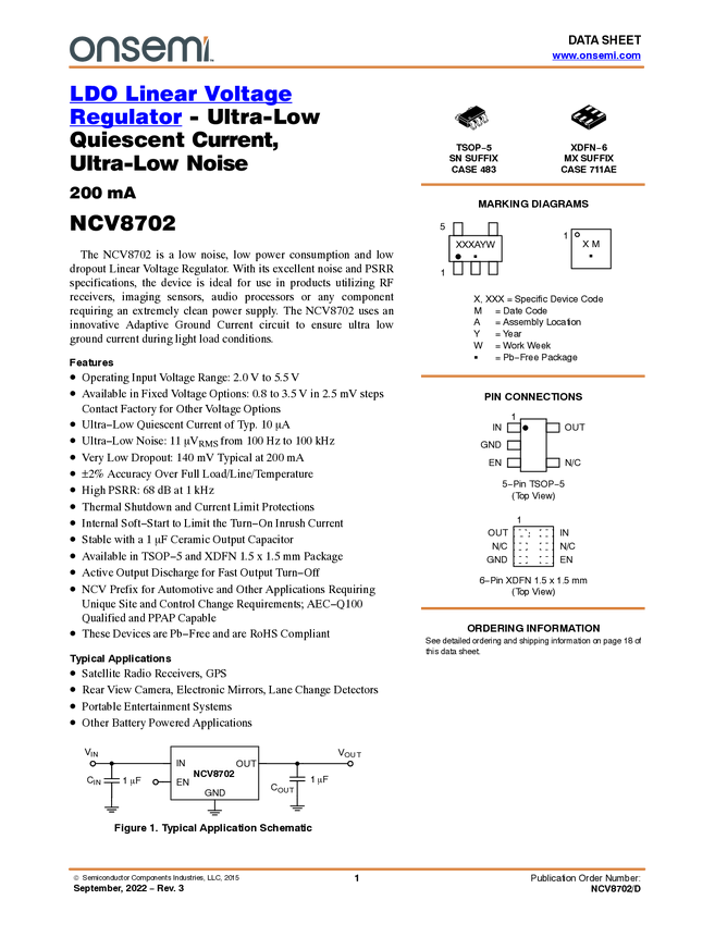 NCV8702 LDO Regulator, 200 mA, Ultra-Low Dropout, Ultra-Low Iq, High PSRR, Ultra-Lo...