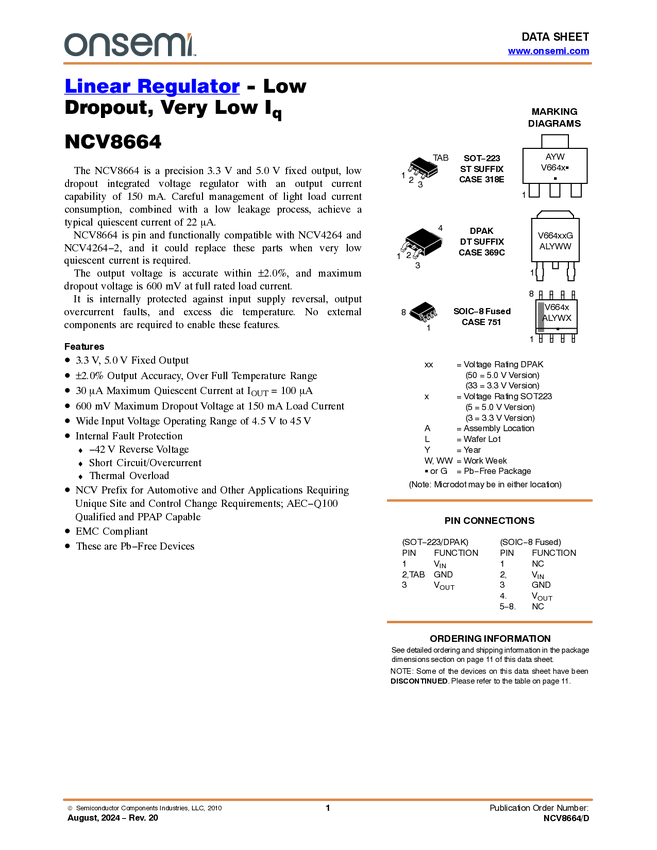 NCV8664 LDO Regulator, 150 mA, 45 V, 21 µA IQ
