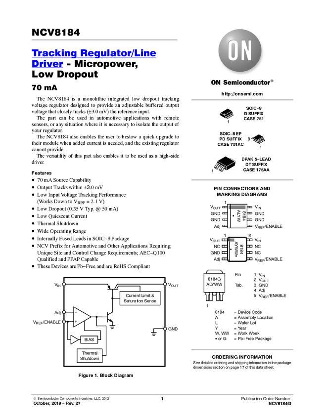 NCV8184 LDO Tracking Regulator, 70 mA, 42 V, 50 µA IQ, with Enable
