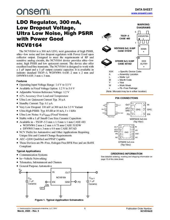 NCV8164 300mA LDO Regulator, Ultra-Low Noise, High PSRR with Power Good
