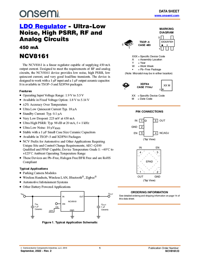 NCV8161 LDO Regulator, 450 mA, Low Dropout, Low Iq, Ultra-High PSRR, Ultra-Low Nois...