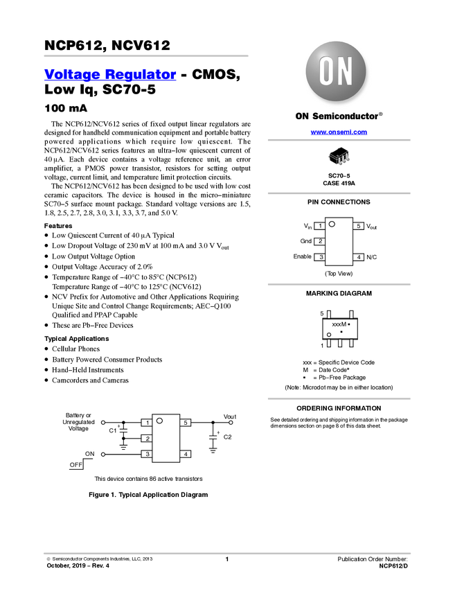 NCV612 LDO Regulator, 100 mA, Low Dropout, Low Iq