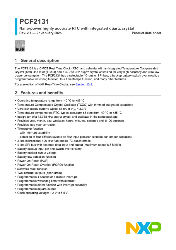 PCF2131TF RTC Module with I2C or SPI interface featuring backup battery switch-over f...