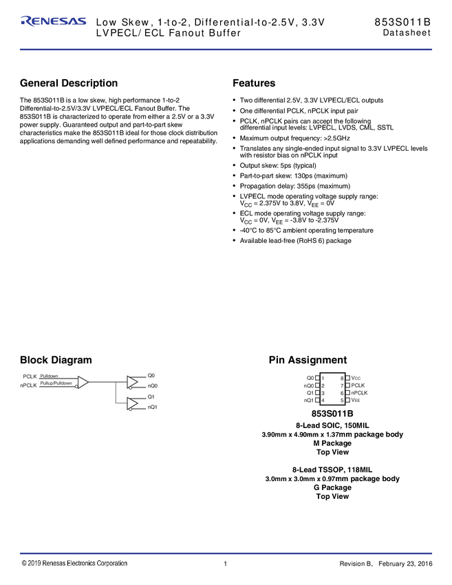 853S011BGILFT Low Skew,1-to-2,Differential-to-2.5V,3.3V LVPECL/ECL Fanout Buffer
