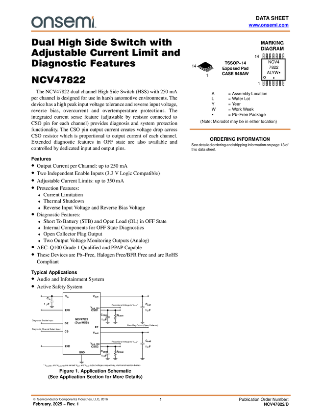 NCV47822 Dual High Side Switch with Adjustable Current Limit and Diagnostic Features