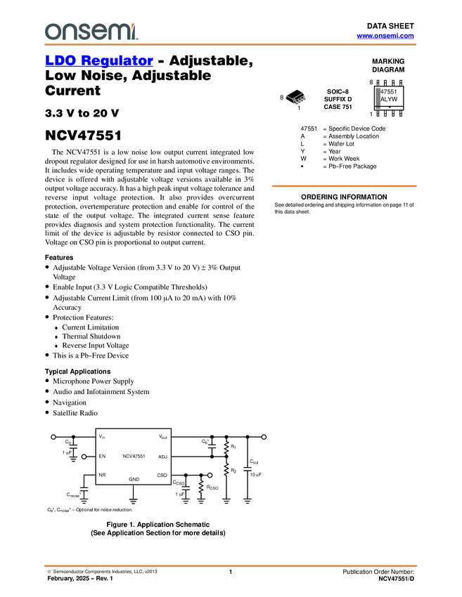 NCV47551 LDO Regulator, 20 mA, Low Dropout, Ultra-High PSRR, Ultra-Low Noise