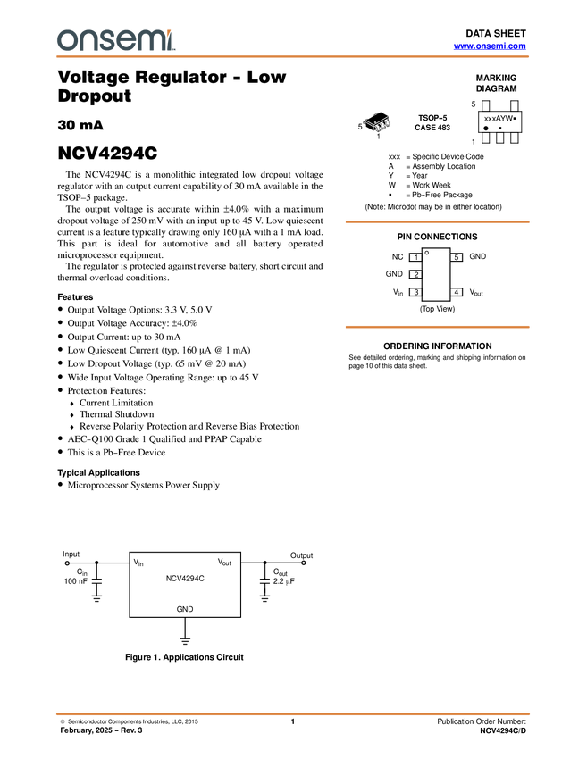 NCV4294C LDO Regulator, 30 mA, 45 V, 150 µA IQ