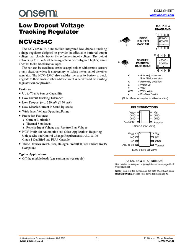 NCV4254C LDO Tracking Regulator, 70 mA, 45 V, 65 µA IQ, with Enable