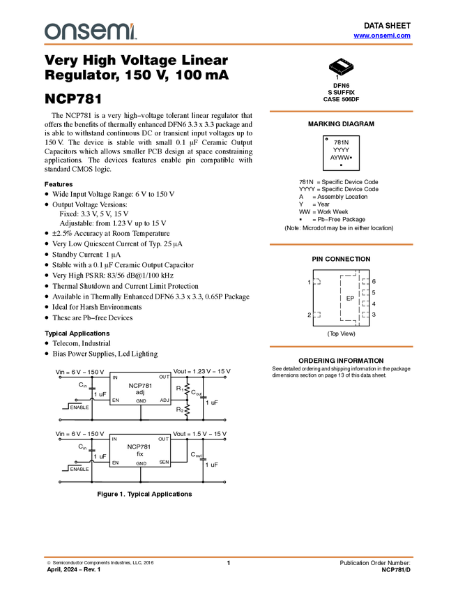 NCP781 Linear Voltage Regulator, 100 mA, 150 V, High PSRR