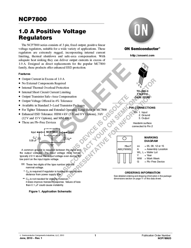 NCP7800 Linear Voltage Regulator, 1 A, High PSRR