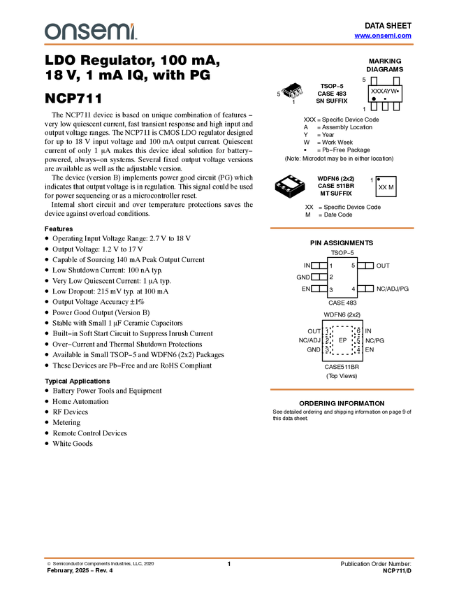 NCP711 LDO Regulator, 100 mA, 18 V, 1 uA IQ, with PG