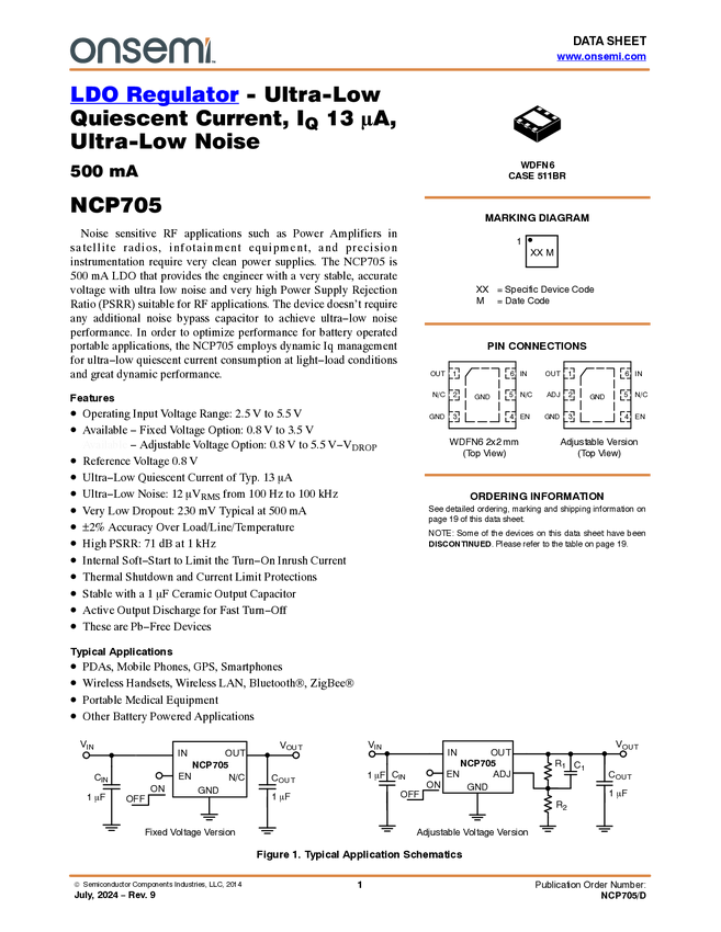 NCP705 LDO Regulator, 500 mA, Ultra-Low Iq, High PSRR, Ultra-Low Noise