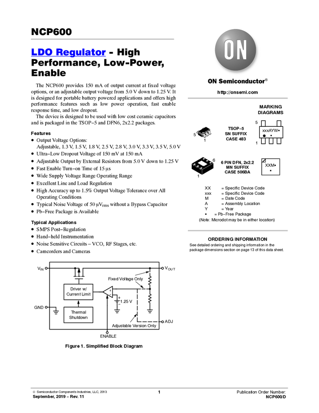NCP600 LDO Regulator, 150 mA, Ultra-Low Dropout, Low Power, High Performance, with...