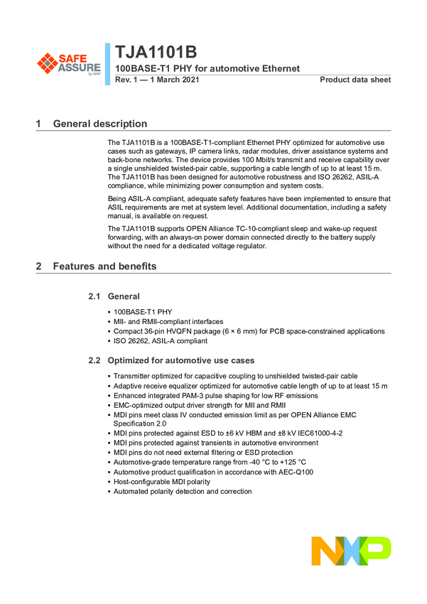 TJA1101BHN IEEE Compliant Automotive Ethernet 100BASE-T1 PHY Transceiver