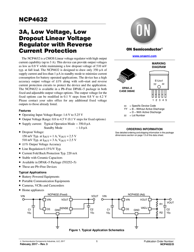 NCP4632 Linear Voltage Regulator, LDO, Low Voltage, 3.0 A, with Reverse Current Pro...