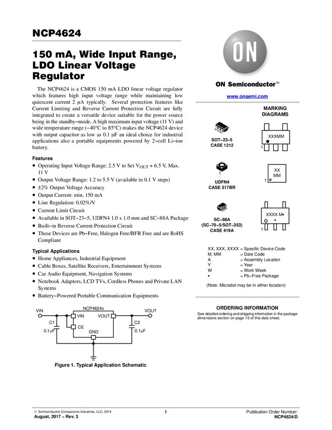 NCP4624 Linear Voltage Regulator, LDO, Wide Input Range, 150 mA