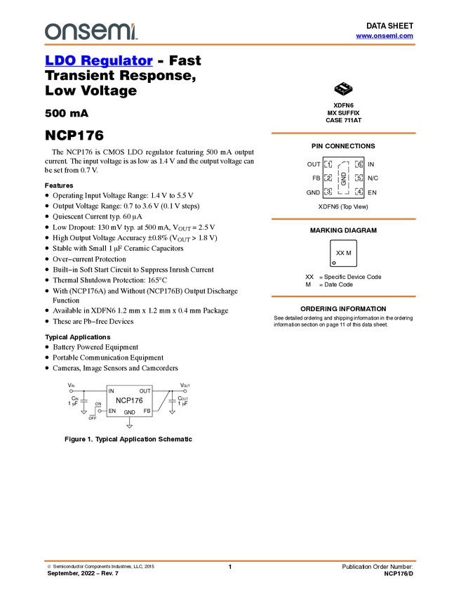 NCP176 LDO Regulator, 500 mA, Ultra-Low Dropout, High PSRR, with Enable