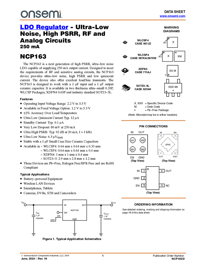 NCP163 LDO Regulator, 250 mA, Ultra-High PSRR, Ultra-Low Noise