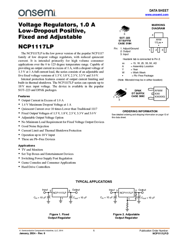NCP1117LP LDO Regulator, 1 A, Fixed and Adjustable, Positive
