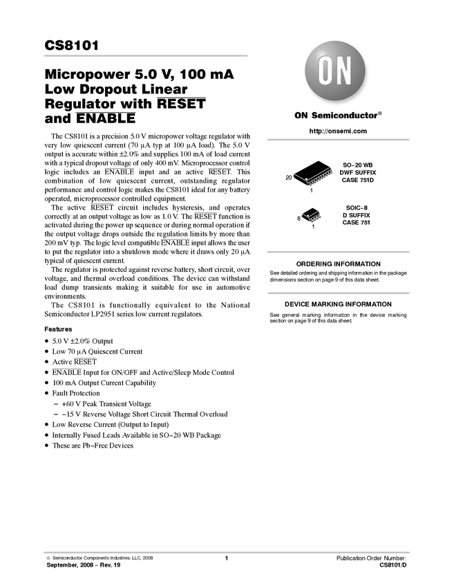 CS8101 Linear Voltage Regulator, LDO, 100 mA, with Reset and Enable