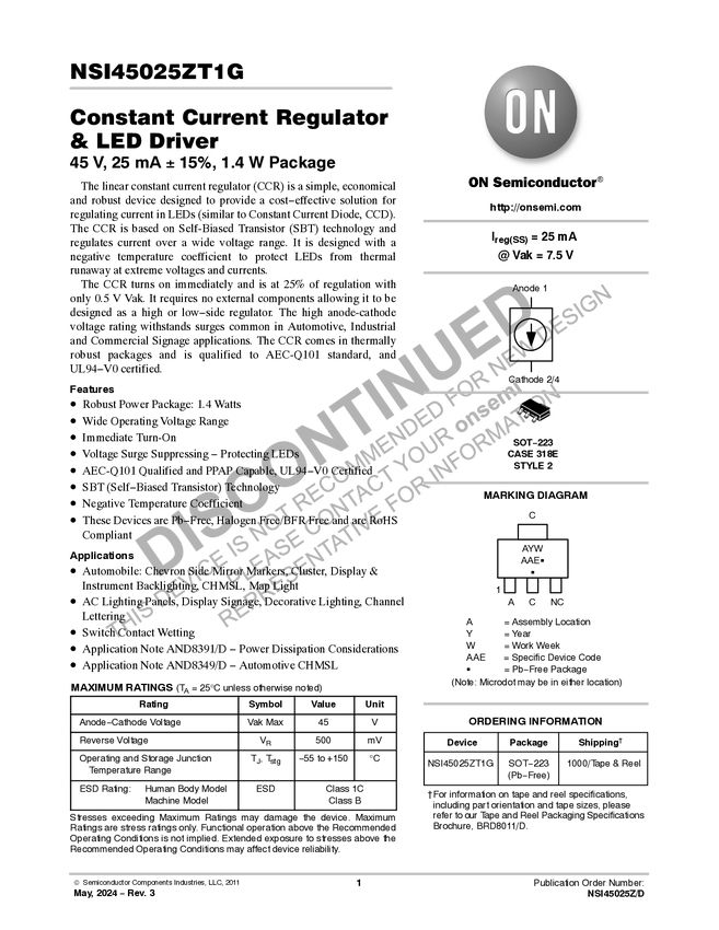 NSI45025Z LED Driver, Constant Current Regulator, 25 mA, 45 V