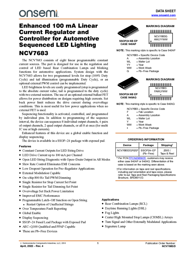 NCV7683 LED Driver, Automotive, Octal, 100 mA Sequencing