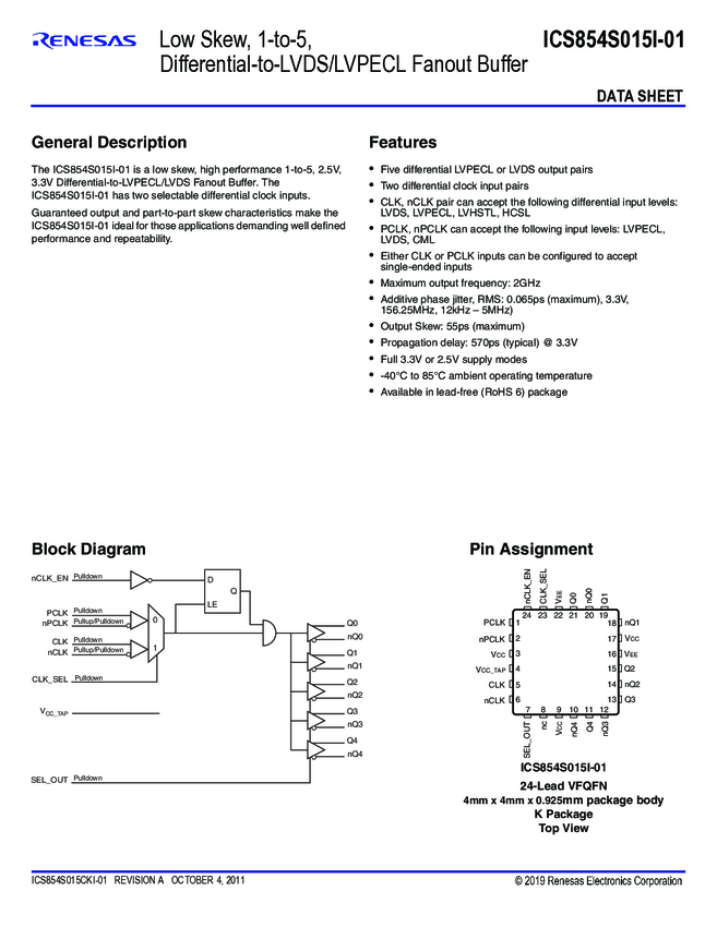 854S015CKI-01LF Low Skew,1-to-5 Differential-to- LVDS,LVPECL Fanout Buffer