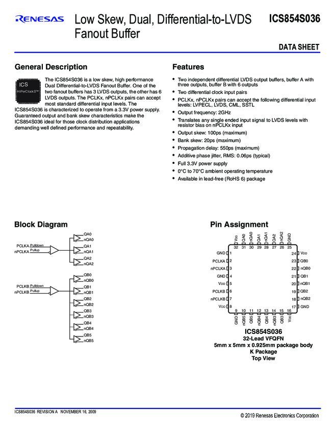 854S036AKLFT Low Skew,Dual,Differential-to-LVDS Fanout Buffer