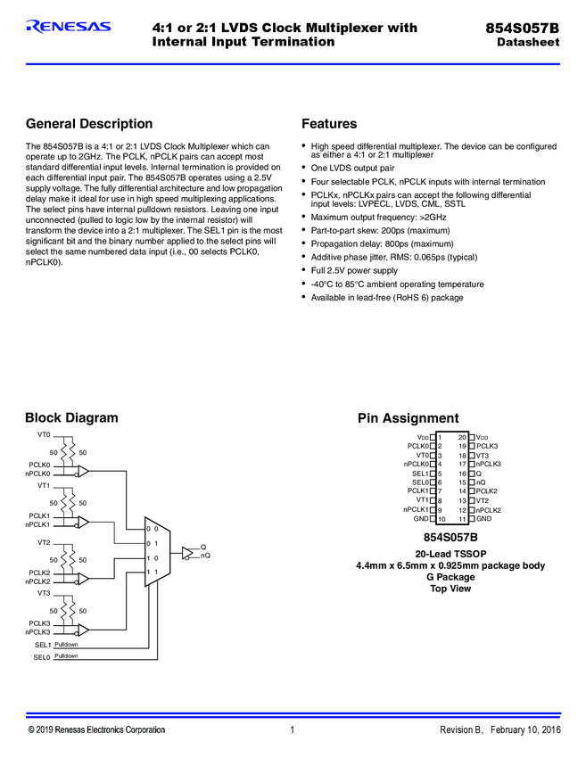 854S057BGILF 4:1 Or 2:1 LVDS Clock Multiplexer With Internal Input Termination