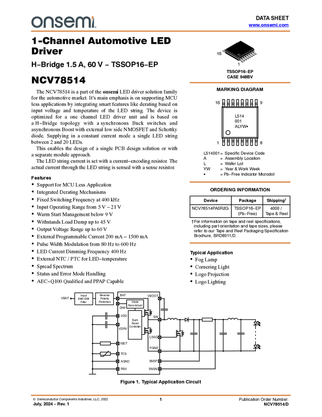 NCV78514  Intelligent single channel H−Bridge automotive LED Driver. VIN 5 - 20 V, V...