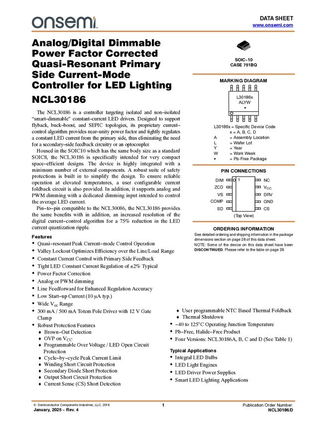 NCL30186 LED Driver, AC-DC Power Factor Corrected Quasi-Resonant Primary Side Curren...