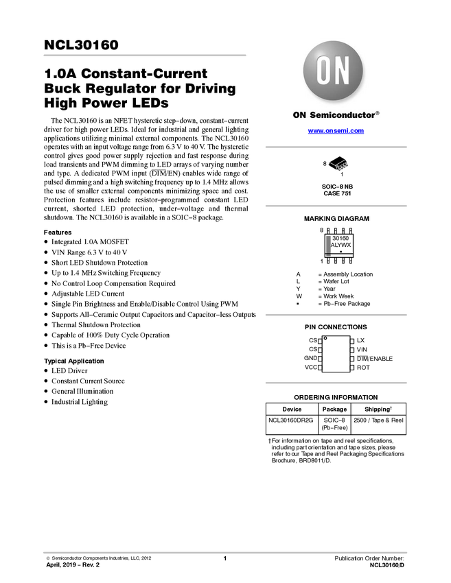 NCL30160 LED Driver, Constant Current Buck Regulator, 1.0 A