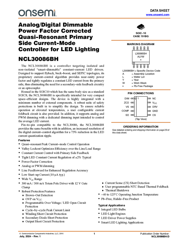 NCL30086BH Analog/Digital Dimmable Power Factor Corrected Quasi-Resonant Primary Side...