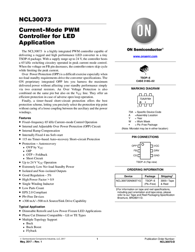 NCL30073 LED Driver, Current-Mode PWM Controller for Phase Cut Dimmable LED Applicat...