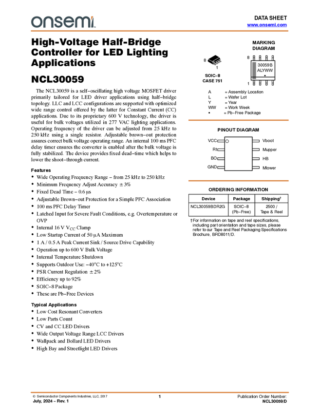 NCL30059 LED Driver, High-Voltage Half-Bridge Controller