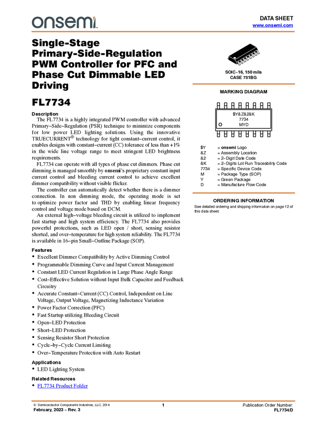 FL7734 LED Driver, Single-Stage Primary-Side-Regulation PWM Controller for PFC and...